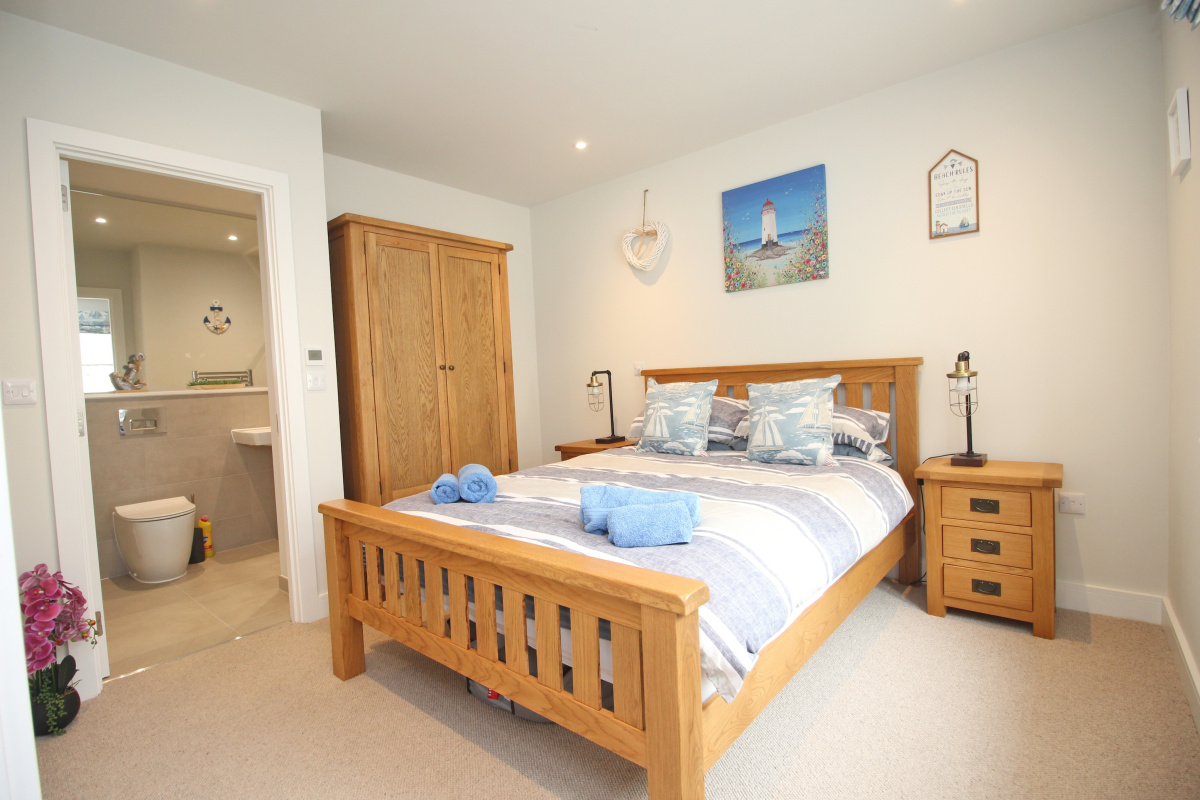 1 Knot Barn can be reached either via steps from the parking area, or by lift from the entrance foyer of The Long Store. Conveniently designed on one level, you enter though a spacious hallway, with plenty of room to store walking boots and beach gear. The master king size bedroom sits to your right, a restful space with ample storage and a large ensuite with walk in shower. A further family bathroom with full bath sits next to the second bedroom, another comfortable king size room.