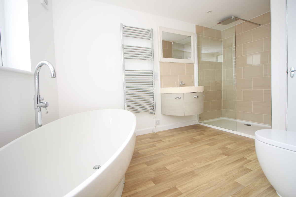 Free standing bath, large walk-in shower, fitted wash hand basin in attractive unit, low level WC, frosted double glazed window to the rear elevation, recessed spotlights, extractor fan, heated towel rail, cupboard housing hot water cylinder.