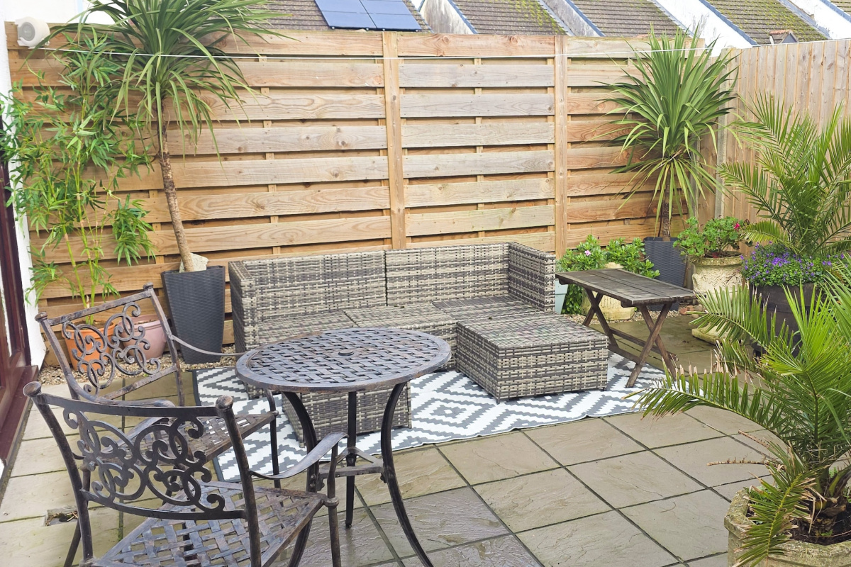 Easy to maintain courtyard garden at the rear with timber fence boundary and log cabin.