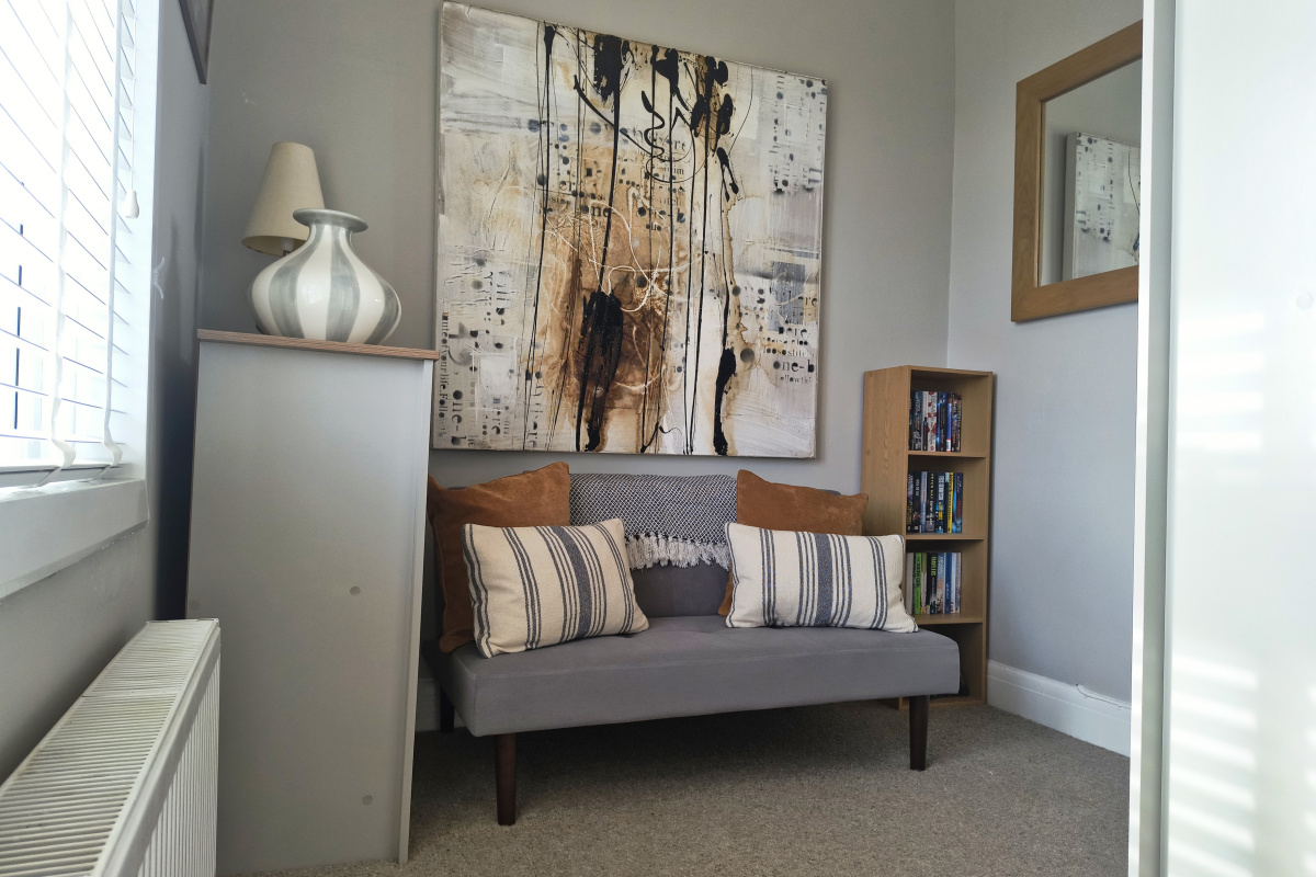On the opposite side of the hallway, the spacious sitting room is a wonderfully inviting retreat, finished in calming tones and centred around a cosy wood-burning stove. A wide glazed door opens directly onto the rear garden, drawing in plenty of light and creating a seamless connection between inside and out.