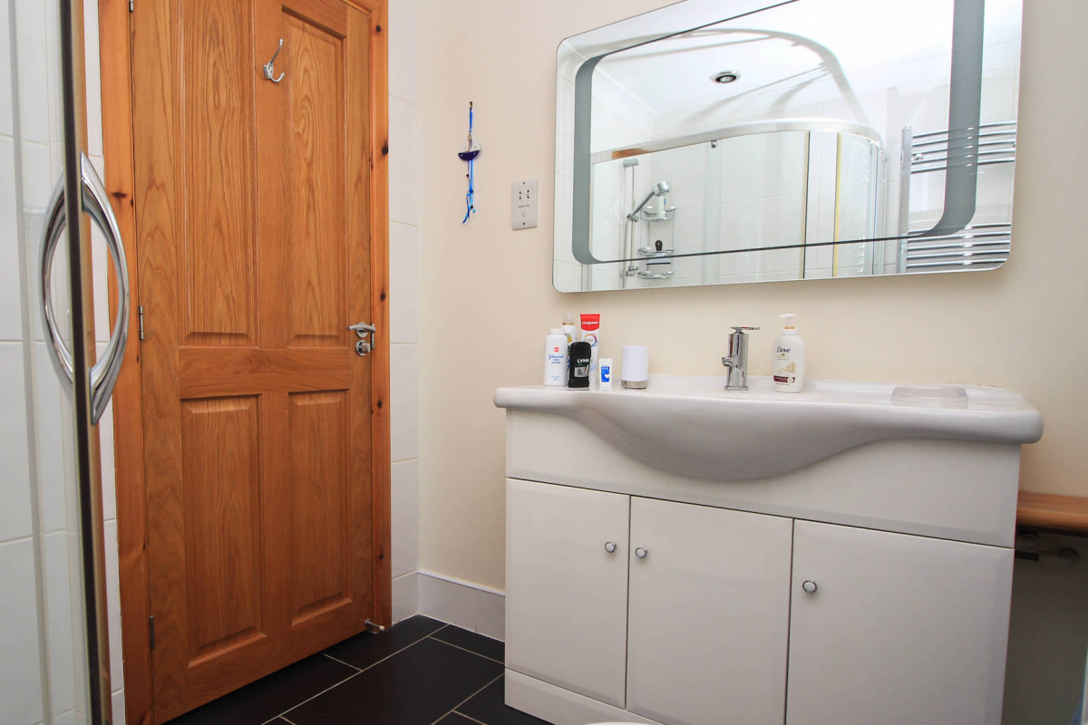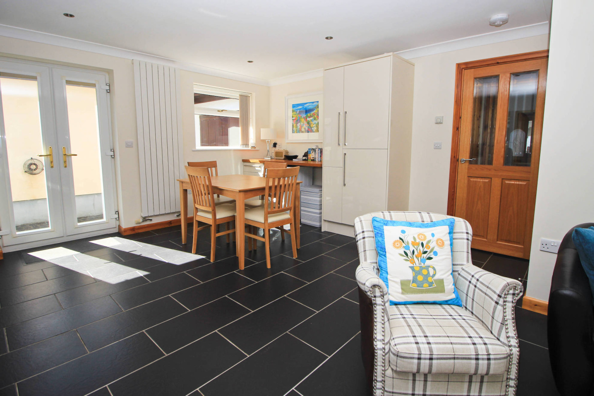 To the right of this lovely room is the living area, all centred around a fireplace. This generous space has room for a variety of seating options and has a large window with views to the front of the property. Slate flooring runs throughout, creating cohesion between rooms and adding to the contemporary feel of the home. A hallway leads off the main living space and takes you to the bright family bathroom, complete with a modern suite and corner shower unit. Next door is the second bedroom, currently set up as a spacious single room, with views over the rear garden. The comfortable master bedroom features large built-in wardrobes with generous storage and wide, glass doors that give access to the pretty rear garden.